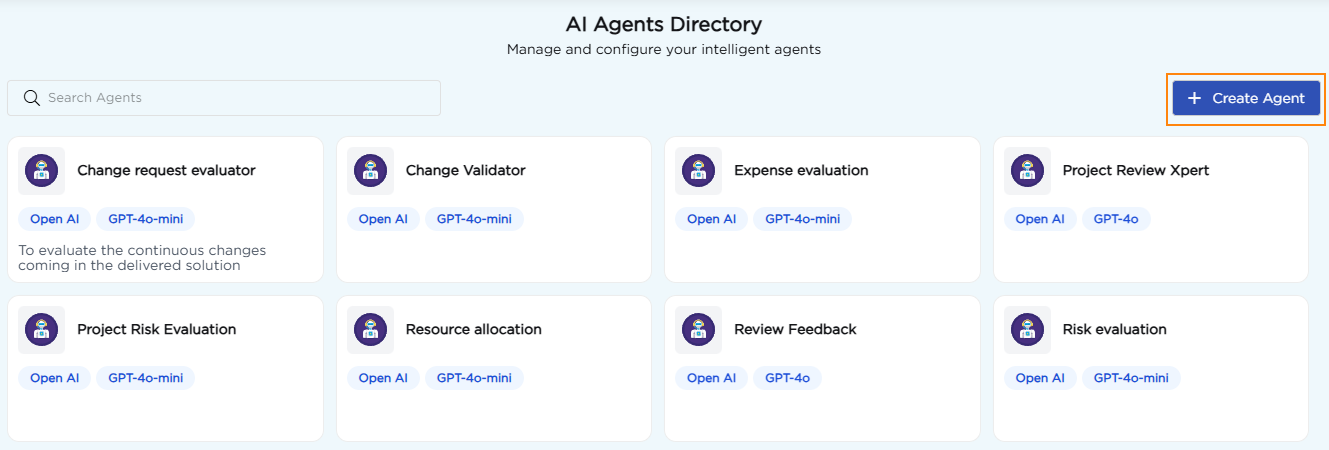 The created agent appears in the AI Agents Directory and becomes available in the Select Agent dropdown when configuring agent steps in workflows.