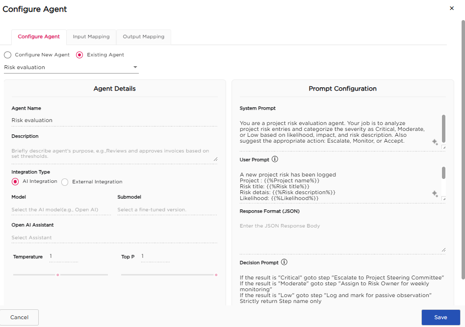When configuring an AI Agent step in a workflow, you can reuse an agent that is already created instead of creating a new one. This helps maintain consistent decision logic and avoids redefining agent configuration across workflows. Follow these steps to use an existing agent:
