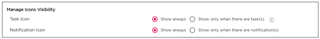 Show only when there are tasks: The icon appears only when the user has pending tasks. (This setting applies only to users who are not Organization Admins, Workspace Admins, or Reporting Managers.)