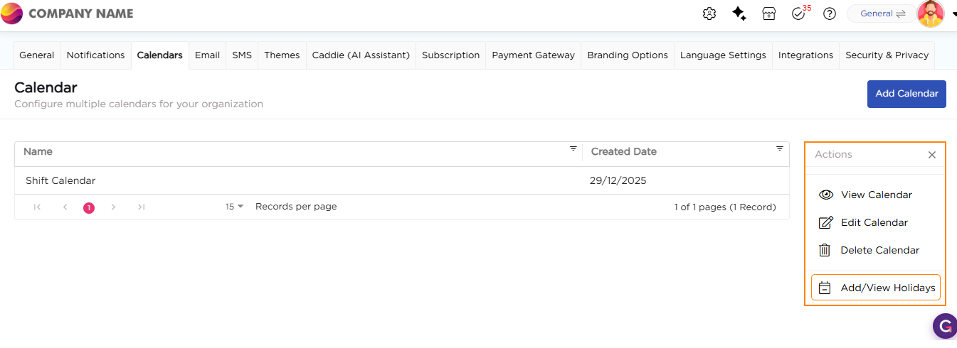 11. You will be able to see the newly created calendar in the calendars list page.