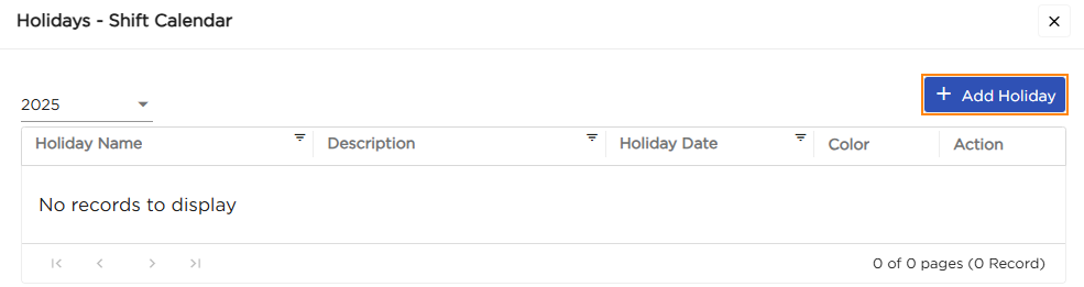 2. Select Add/View Holidays. The Holidays page opens and displays the selected year.