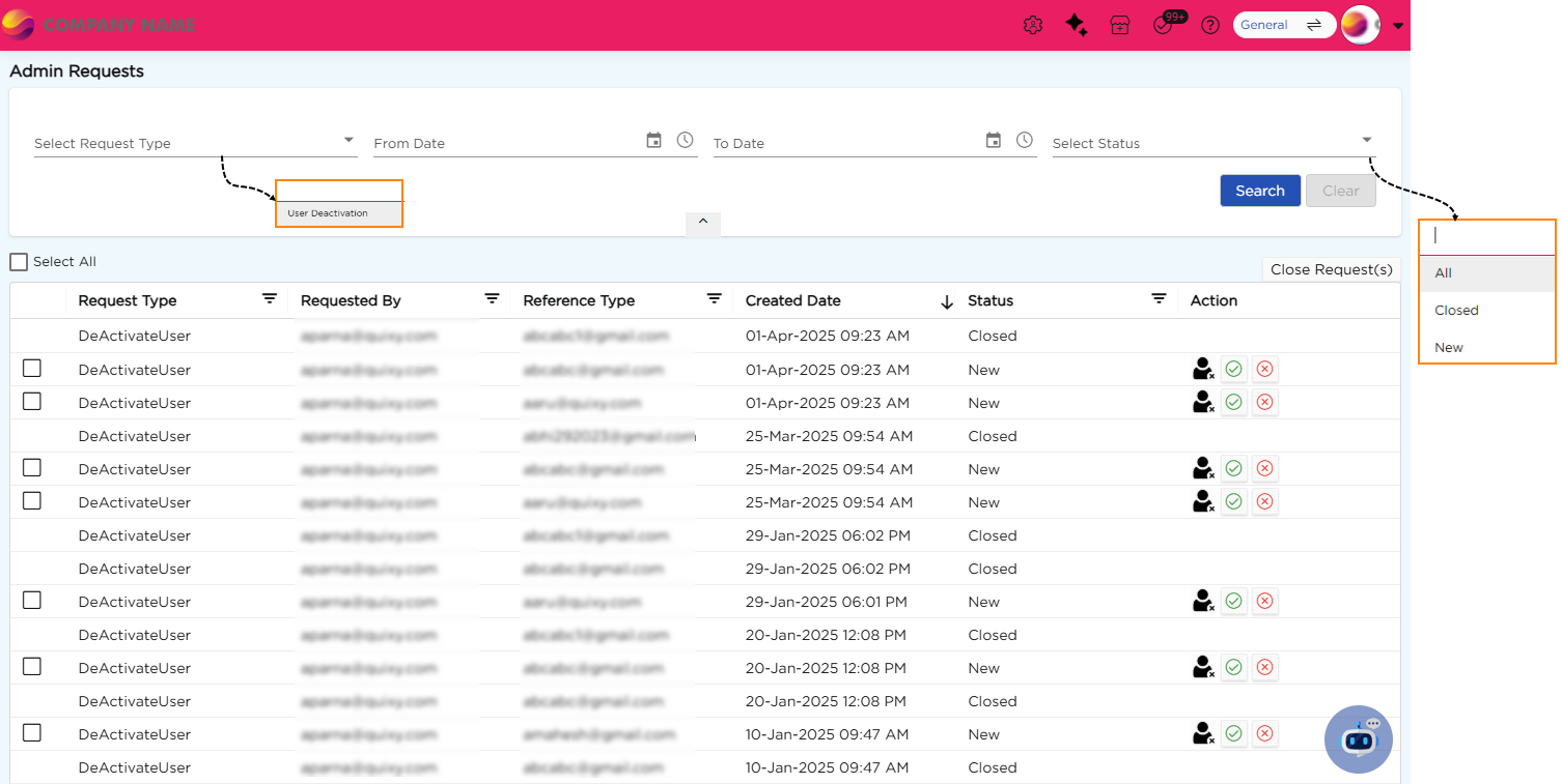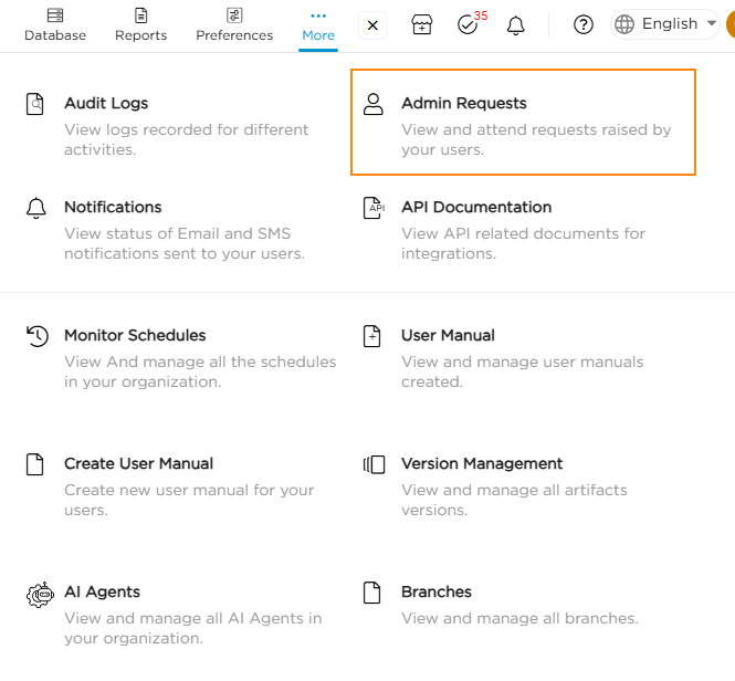 The requests which are raised by the users in an organization to take an action or give some permissions will get recorded in the Admin Requests.