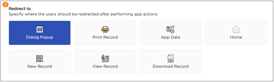 Controls where users are redirected after submitting a record. The image below shows the available Redirect To options that define post-submission navigation: