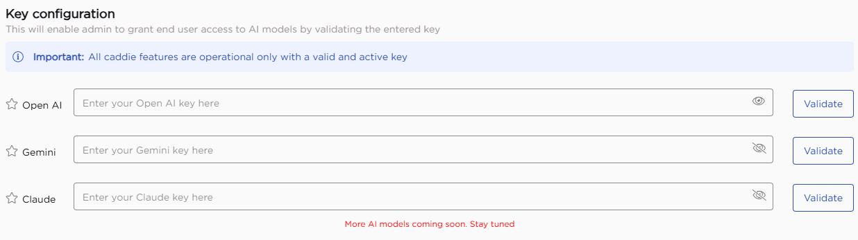 Caddie is designed to work with leading AI providers such as OpenAI, Gemini, and Claude, giving you the flexibility to choose the service that best fits your organization’s needs. You can add keys for: