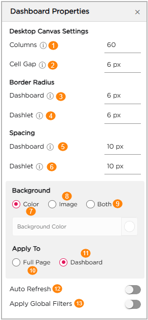 | 2 | Cell Gap | Controls the space between dashlets on the canvas. |
