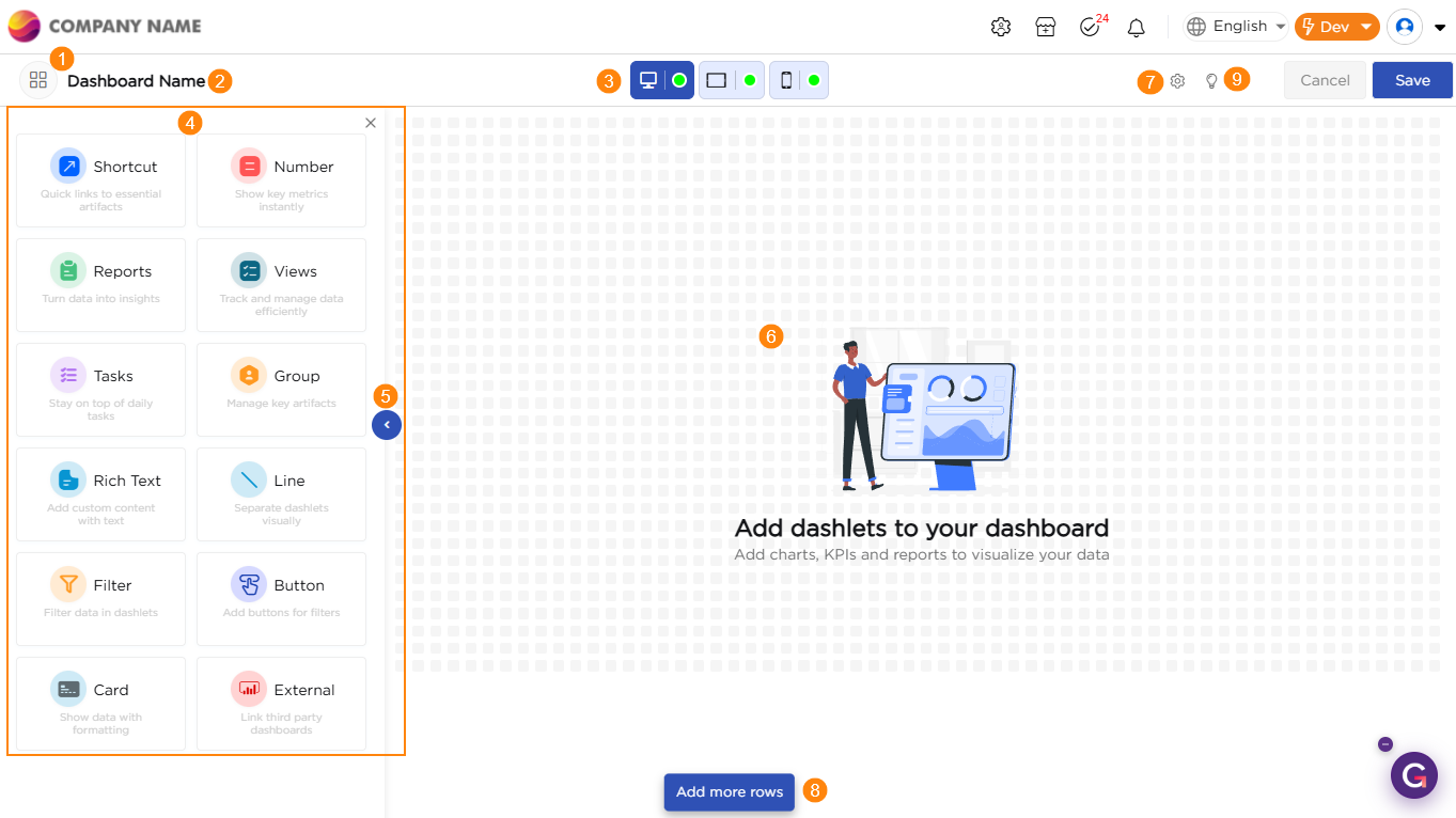 | 8 | Add More Rows | Extends the canvas height by adding extra rows for placing more dashlets. |