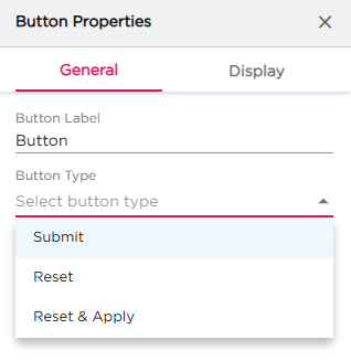 Once you drag and drop the dashlet onto the canvas and click the dashlet, a blue line appears surrounding the dashlet border, and a settings icon shows on the right side of the dashlet. When you click the settings icon, the properties panel opens on the right. The properties panel is divided into two sections, General and Display.
