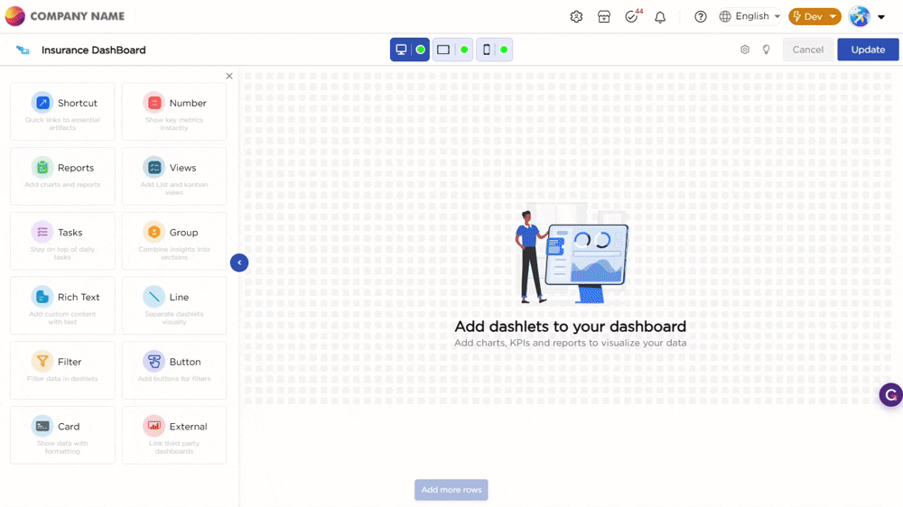 Once you drag and drop the dashlet onto the canvas and click the dashlet, a blue line appears surrounding the dashlet border, and a settings icon shows on the right side of the dashlet. When you click the settings icon, the properties panel opens on the right. The properties panel is divided into two sections, General and Display.