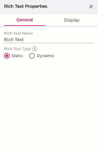 After saving the content, and when you click the settings icon, the properties panel opens on the right. The properties panel is divided into two sections, General and Display.
