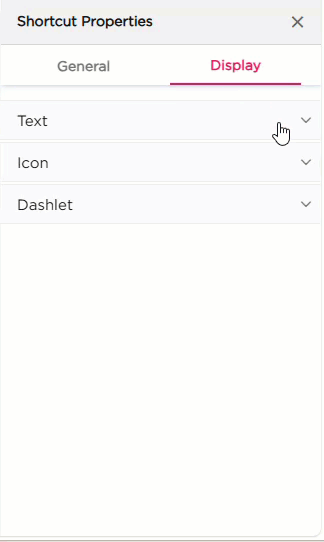 The Display settings control the appearance of the Shortcut dashlet. It includes three groups of settings: Text, Icons, and Dashlet.