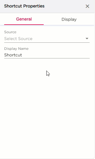Once you drag and drop the dashlet onto the canvas and click the dashlet, a blue line appears surrounding the dashlet border, and a settings icon shows on the right side of the dashlet. When you click the settings icon, the properties panel opens on the right. The properties panel is divided into two sections, General and Display.