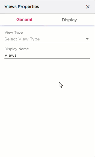 Once you drag and drop the dashlet onto the canvas and click the dashlet, a blue line appears surrounding the dashlet border, and a settings icon shows on the right side of the dashlet. When you click the settings icon, the properties panel opens on the right. The properties panel is divided into two sections, General and Display.