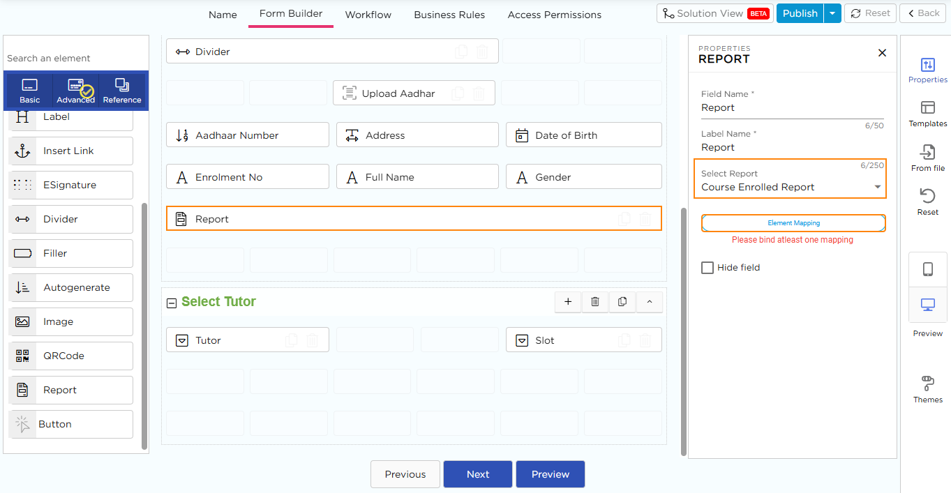 The Report element allows attaching an existing report from the Quixy platform directly to the application. This simplifies data presentation and ensures seamless integration between form entries and report details.