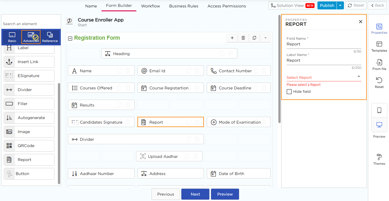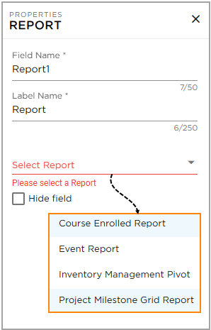 Navigate to the Form Builder, under the Advanced Elements category, drag and drop the Report element into the application. Once added, the Properties panel will appear on the right side displaying the Report Properties.