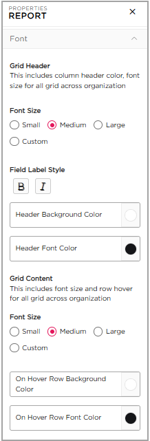 Font Properties- Grid Customization: Once element mapping is saved, the Properties panel expands with grid customization options, since reports are displayed in a tabular (row-and-column) format. These settings control how the grid appears inside the application.