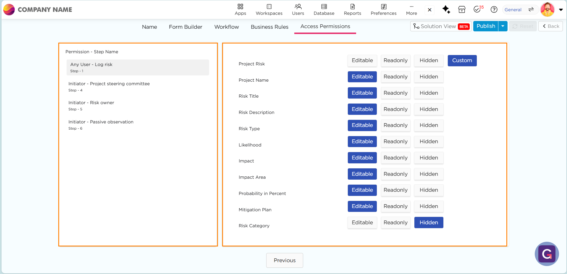 Project Risk and Risk Title are set as Editable, allowing users to input data.