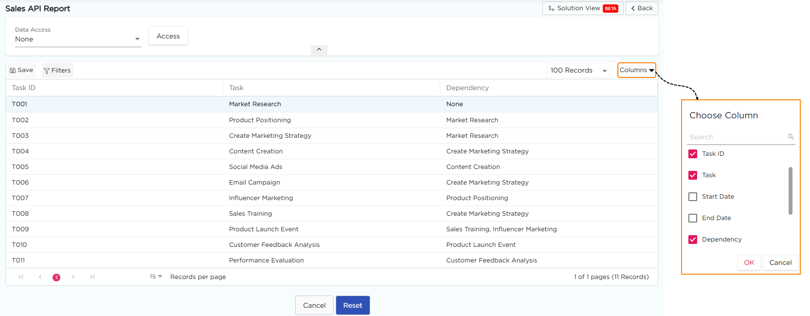 | Columns (Right Panel) | Show or hide specific columns to control which data fields are included in the API response payload. |
