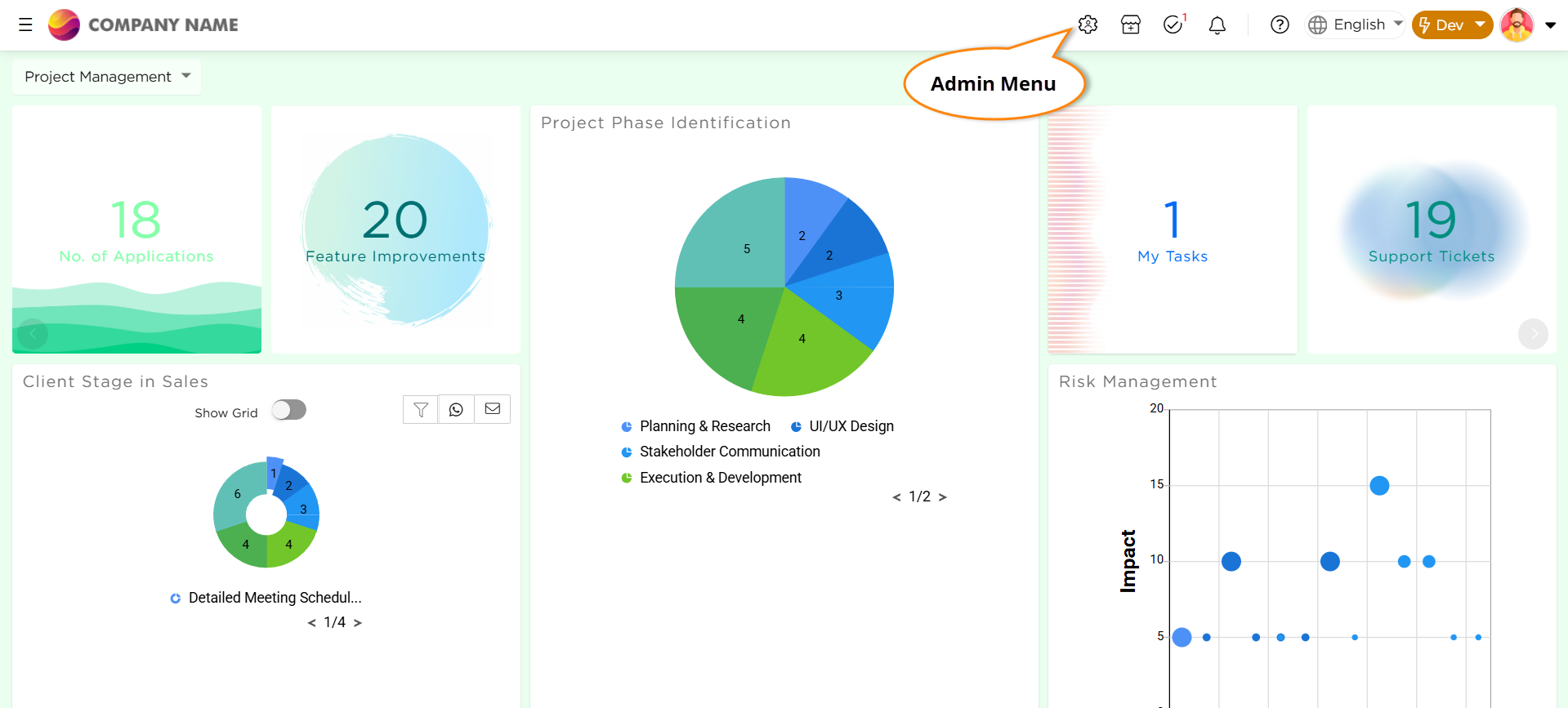 3.Once switched to Dev stage, the platform will move into developer mode where in you will find the developer option, i.e., Admin Menu.