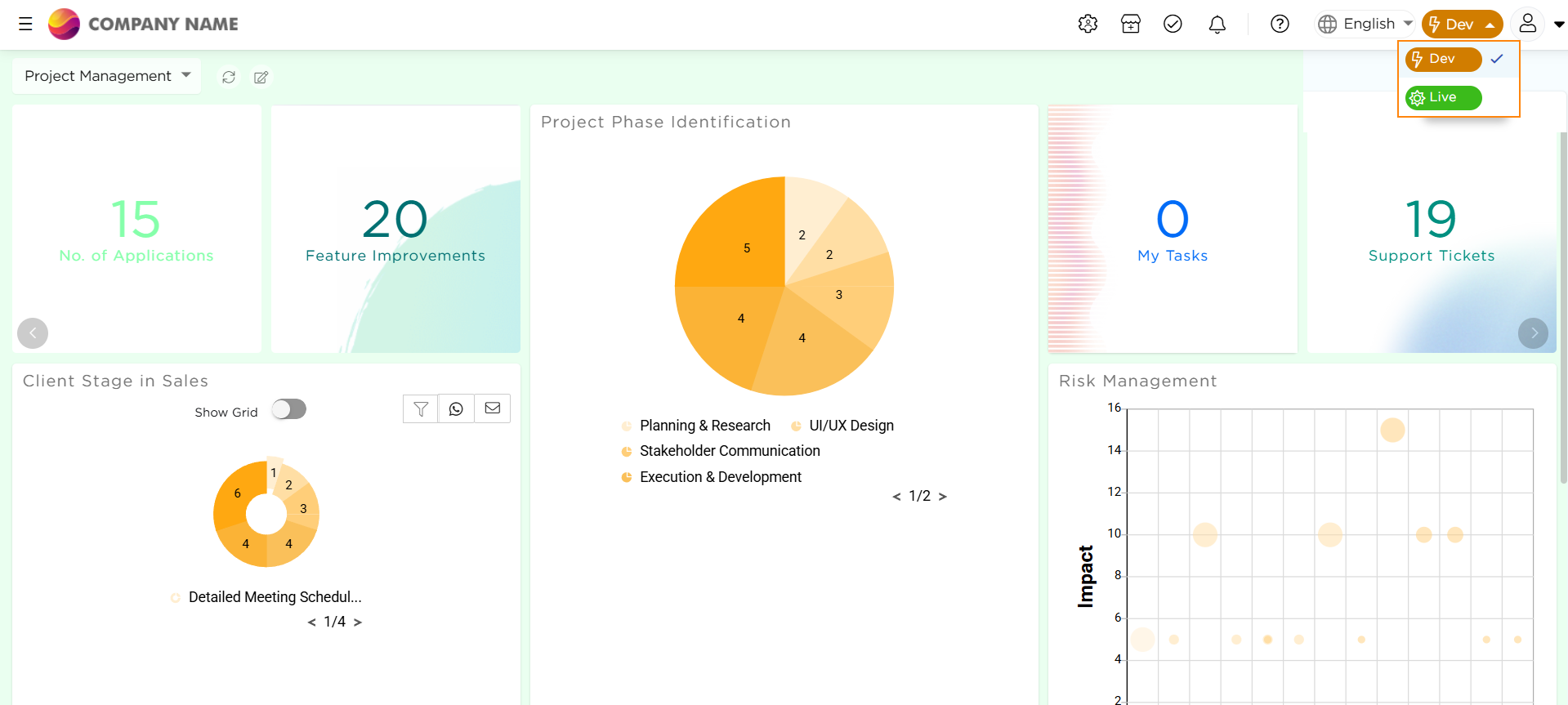 Any user (End-User, Organization Admin, Data Admin, Workspace Admin) who log in to the platform will initially land on the live stage where they can perform live interactions and transactions. However, the citizen developers, i.e., Organization Admin, and Workspace Admin will have the option to shift from the Live stage to the Dev stage to develop solutions and test it before moving the solution to the live stage for actual use.