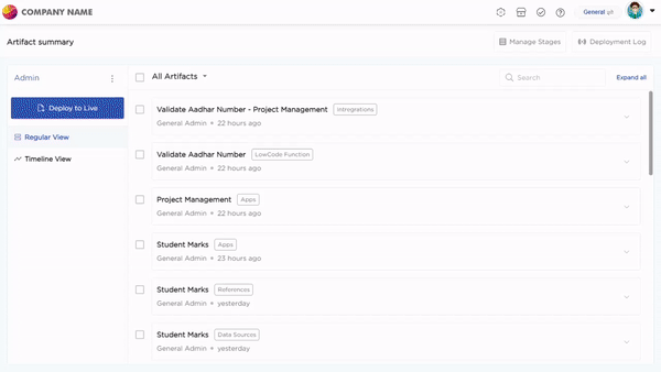 11.In the General branch, you will find the list of various newly created artifacts and modifications made to any existing artifacts ready to be published to the Live environment.