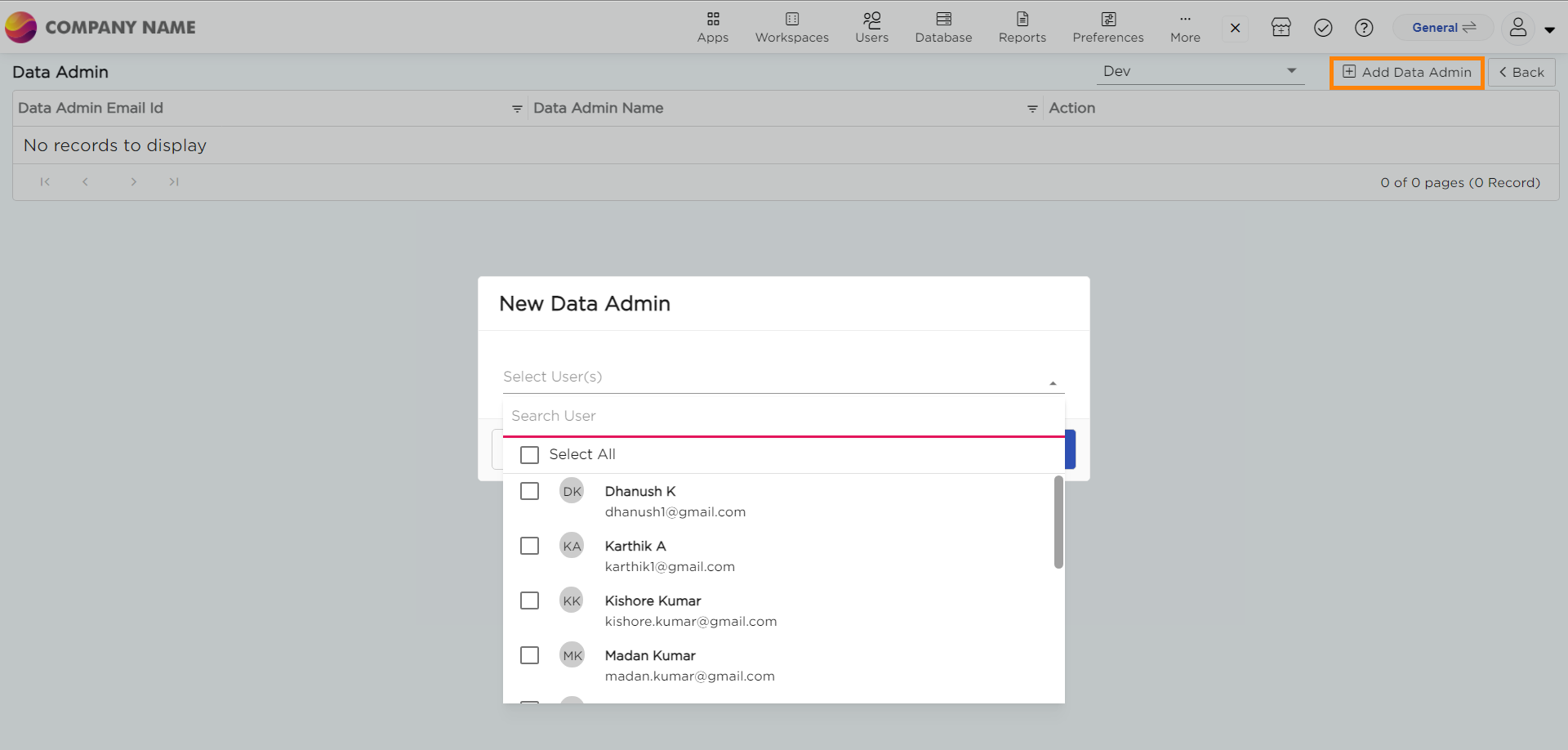 5. A pop-up named New Data Admin will appear. Select the user you want as a Data Admin.