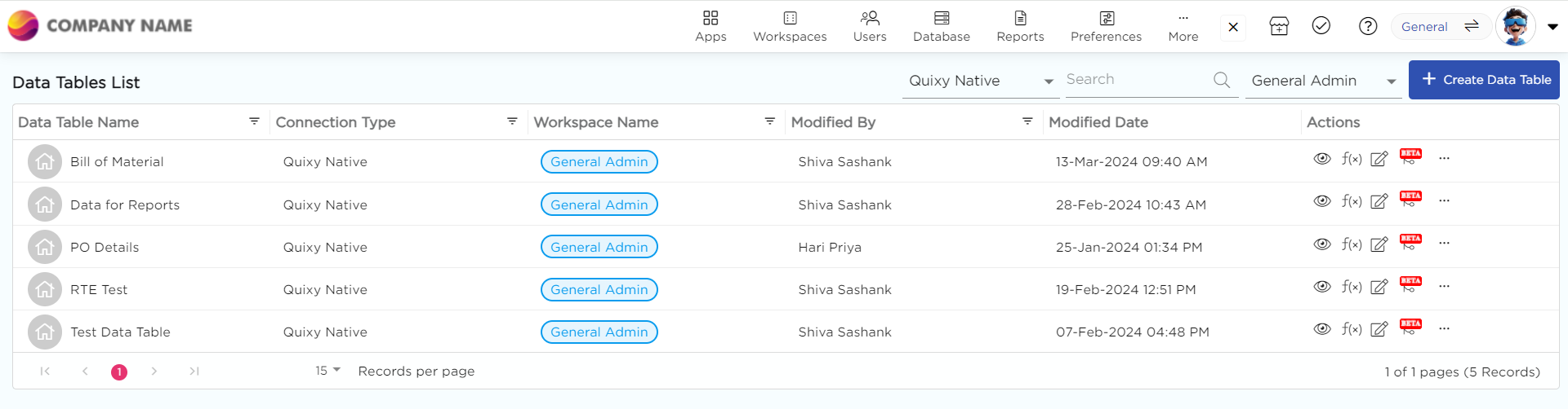 You will land on the Data Tables List page. Choose a data table for which you want to create a data table function and click Manage Functions corresponding to that particular data table.