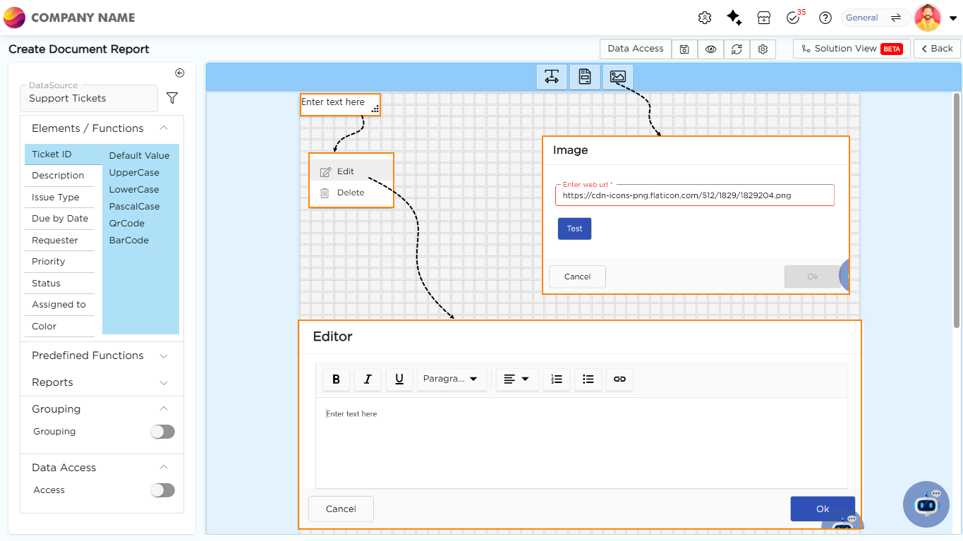 | 2 | Rich Text Editor | This Works same like a text label but with more text customization options like inserting HTML snippets for design, can insert images, print options just like a word document. |