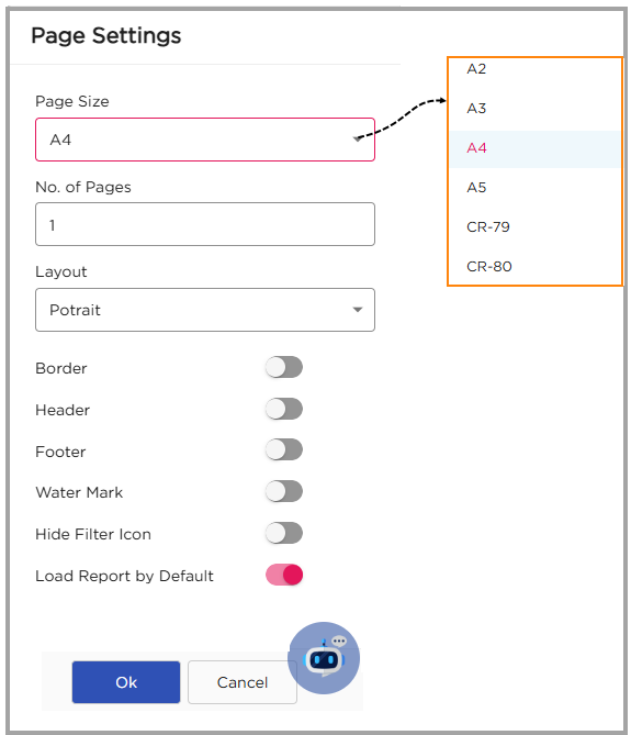 | 12 | Page Settings | In this page setting, you will be able to set the page Size, layout, no of pages you want for a document. Not only just the page size or layout you can even set the water mark and borders for the report designed as stated below. |