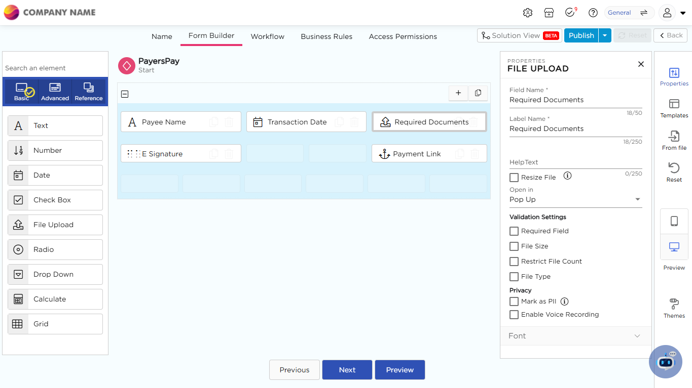 Citizen Developers have more flexibility in how uploaded files are accessed. When configuring file uploads, CDs can decide whether files open in a pop-up within the same tab or in a new tab, providing a more customized user experience.