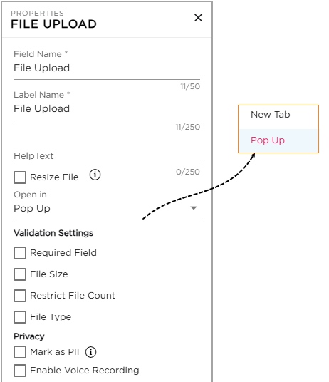 Open in: Defines how uploaded files will be displayed when accessed. Files can either open in a Pop-up within the same tab or in a New Tab, giving users flexibility and a smoother viewing experience.