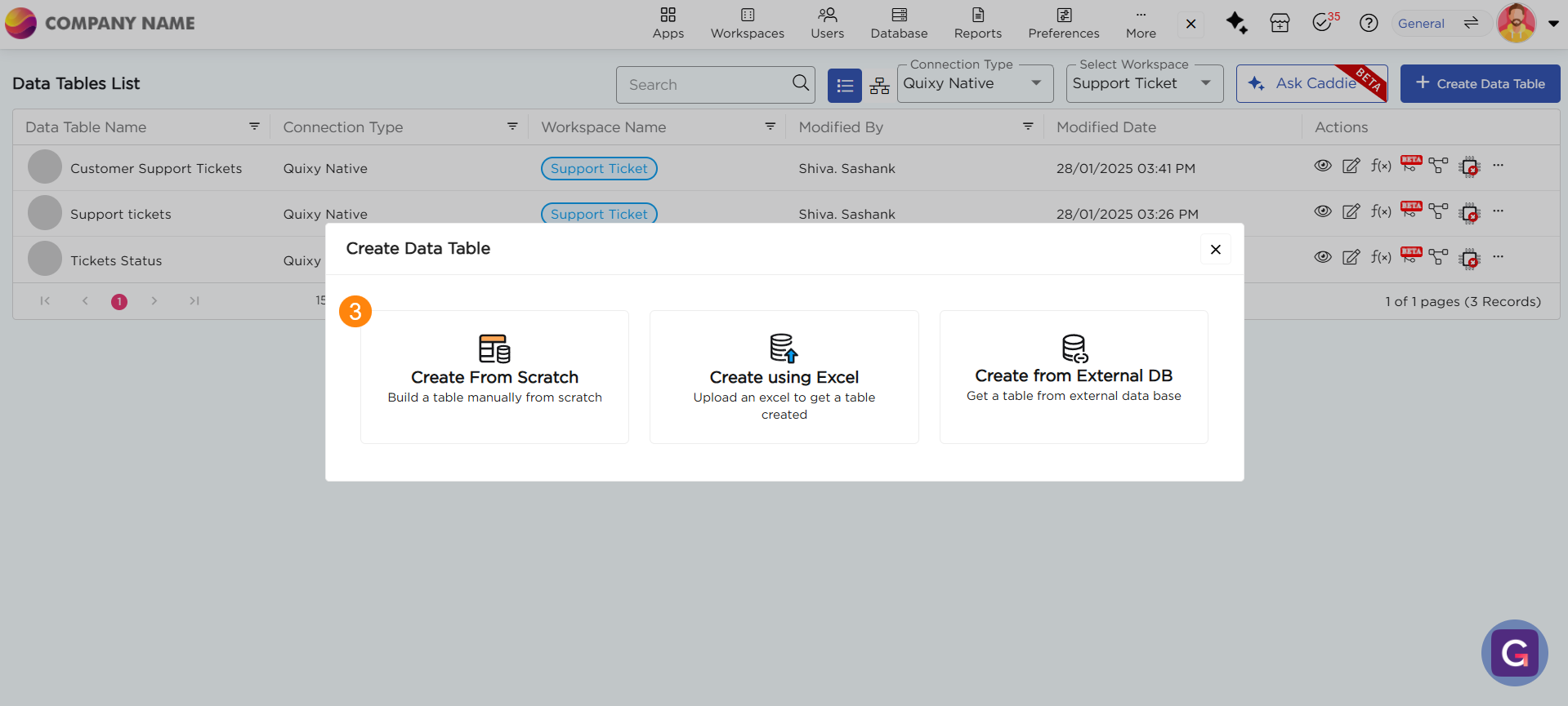 Citizen Developers can use plain text commands to instruct our Caddie to create data tables, including multiple tables with relationships and keys, automatically. Caddie generates a high-level ER diagram and allows for iterative adjustments through simple text instructions until requirements are met.