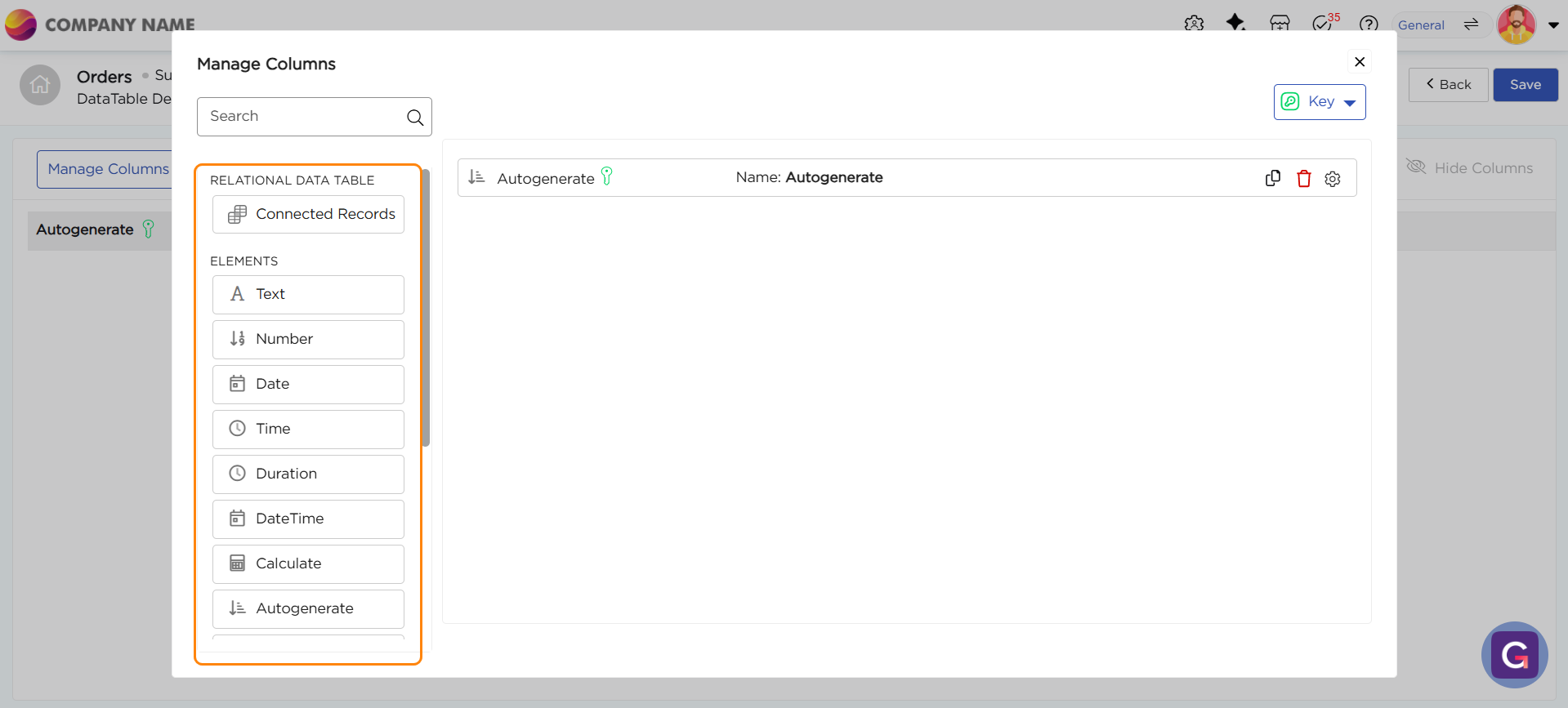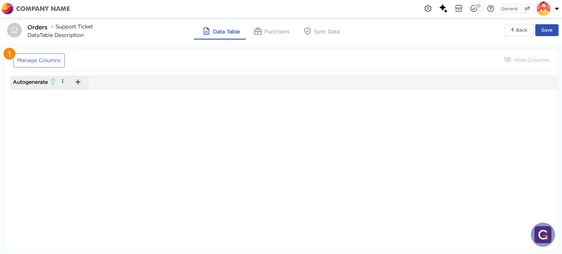 6. Click Manage Columns to start adding fields to your data table.