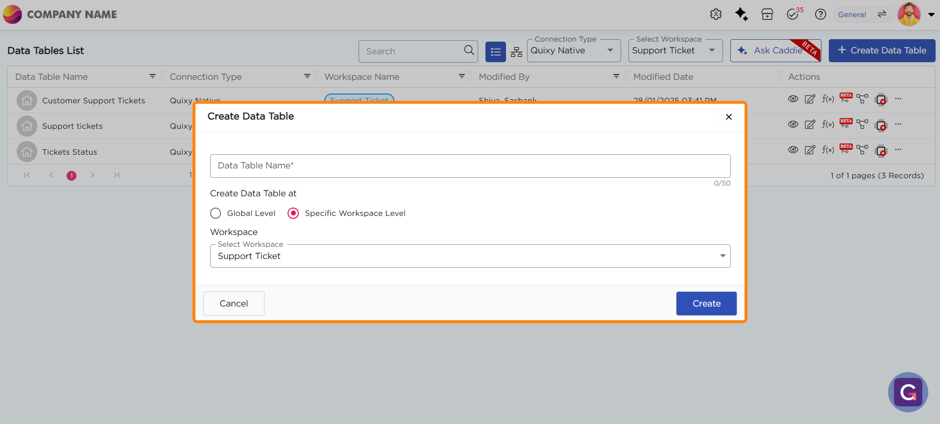 3. A Create Data Table pop-up window will appear. Provide a name for the table and choose where to save the data table