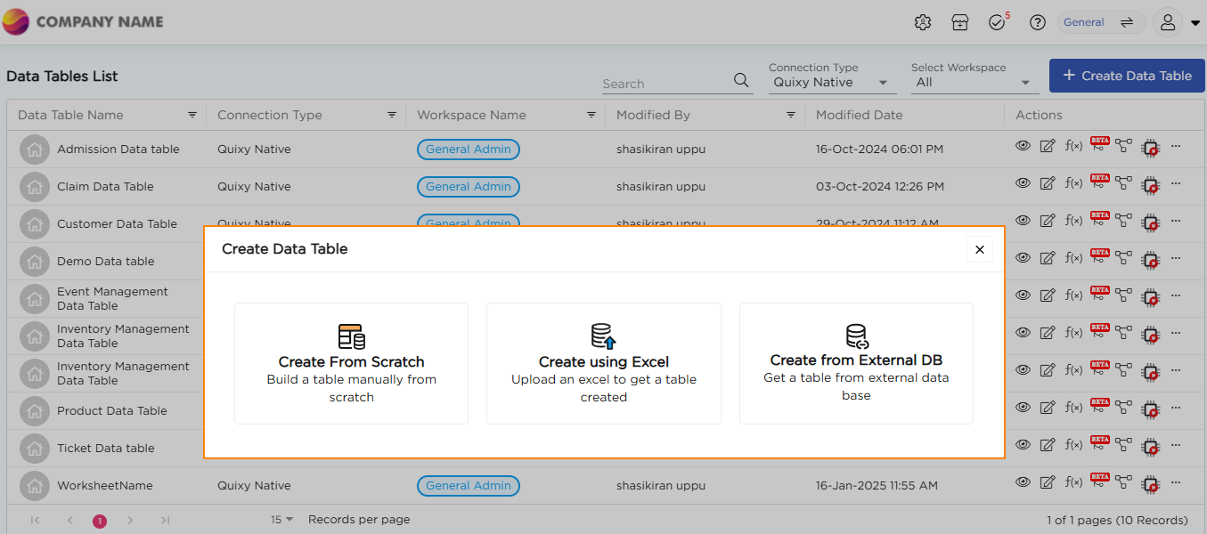 In addition to the traditional manual process of creating a data table, you can create a data table by uploading an Excel file containing your desired data. The platform will automatically detect the data fields, provide a preview, and allow you to refine the fields before creating the data table and importing the data.