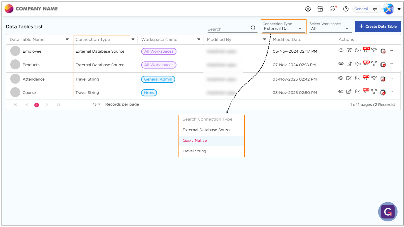 From the Connection Type dropdown, switch from Quixy Native to the External Database Connection you created.