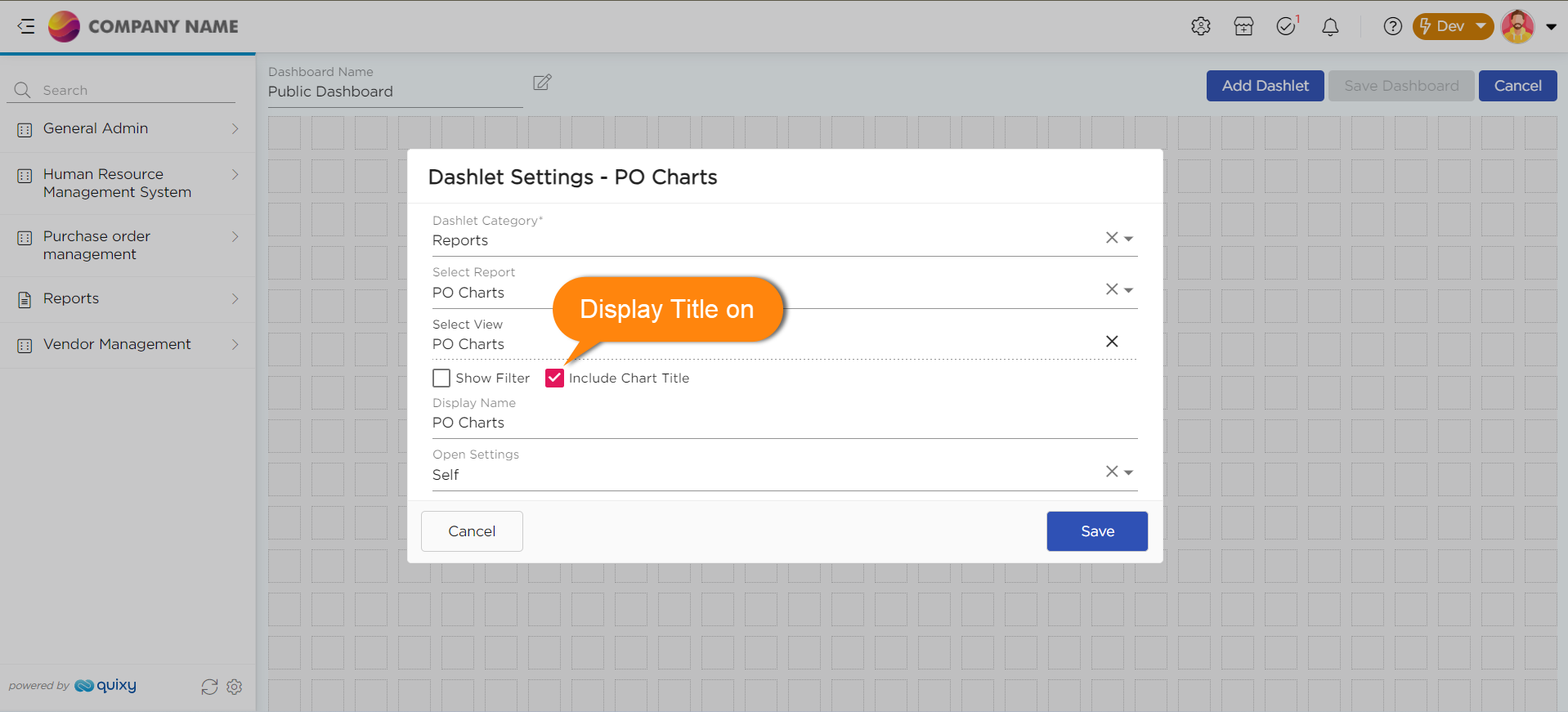 8.1. When adding a Charts Report to the dashboard, you can now choose to include or exclude the chart title by enabling "Include Chart Title" in the dashlet settings.