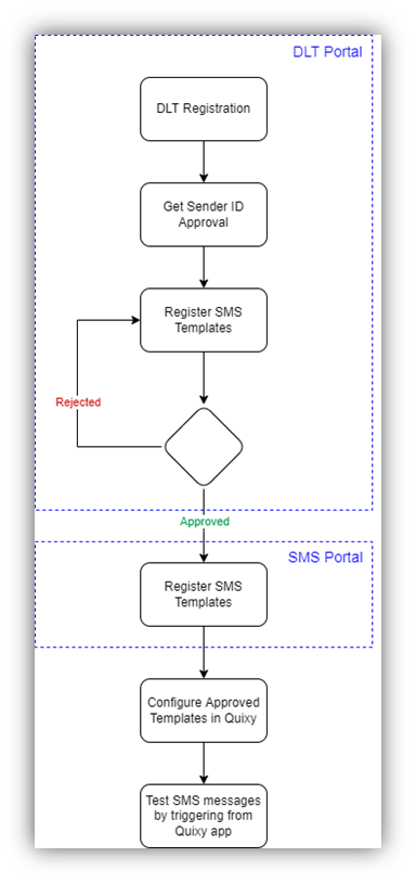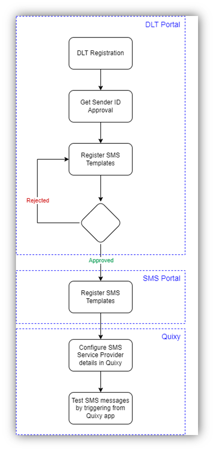 Organizations with their own dedicated DLT Registration & SMS Service Provider have complete freedom to obtain TRAI approvals for SMS templates and use them to send through their own dedicated SMS Service Provider. Since SMS messages are initiated by Quixy, Organization Admins must configure the third-party SMS Service Provider in Quixy.