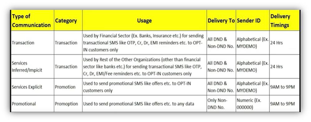 Obtaining TRAI approval is required to register a Sender ID, which is then used by the SMS Service Provider to send SMS. (Sample Sender ID: VVDQXY). The TRAI approves the SMS templates using the DLT platform.