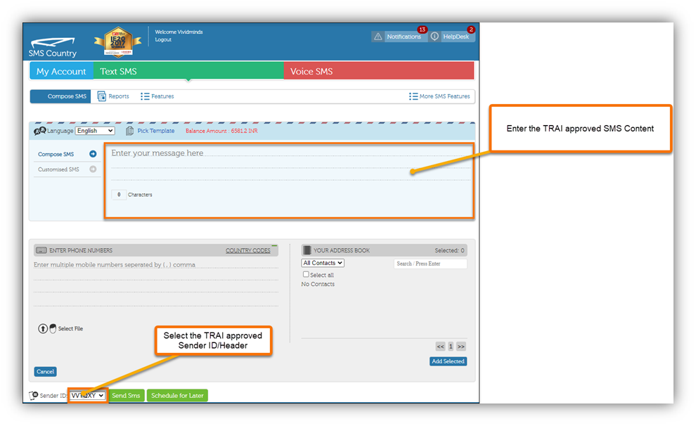 The process of sending an SMS with any SMS service provider is the same; all they need is the SMS Template and Sender ID/Header approved by TRAI.