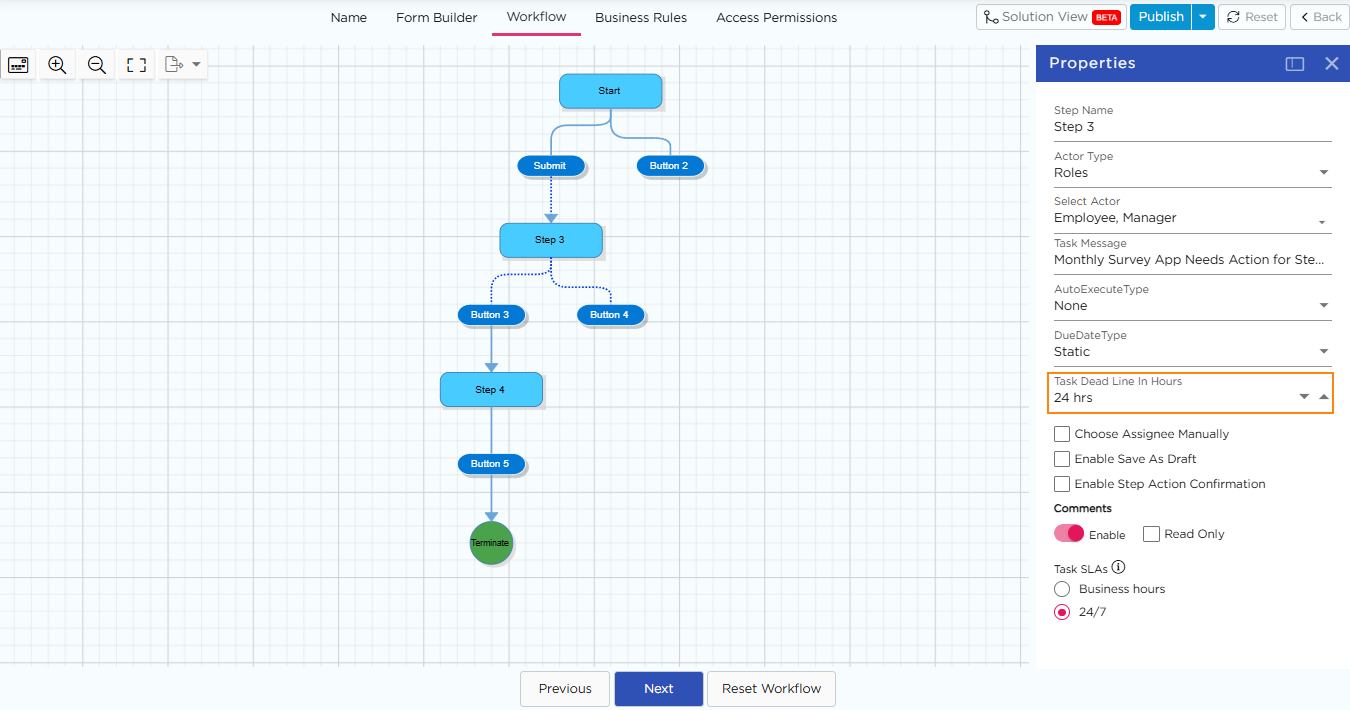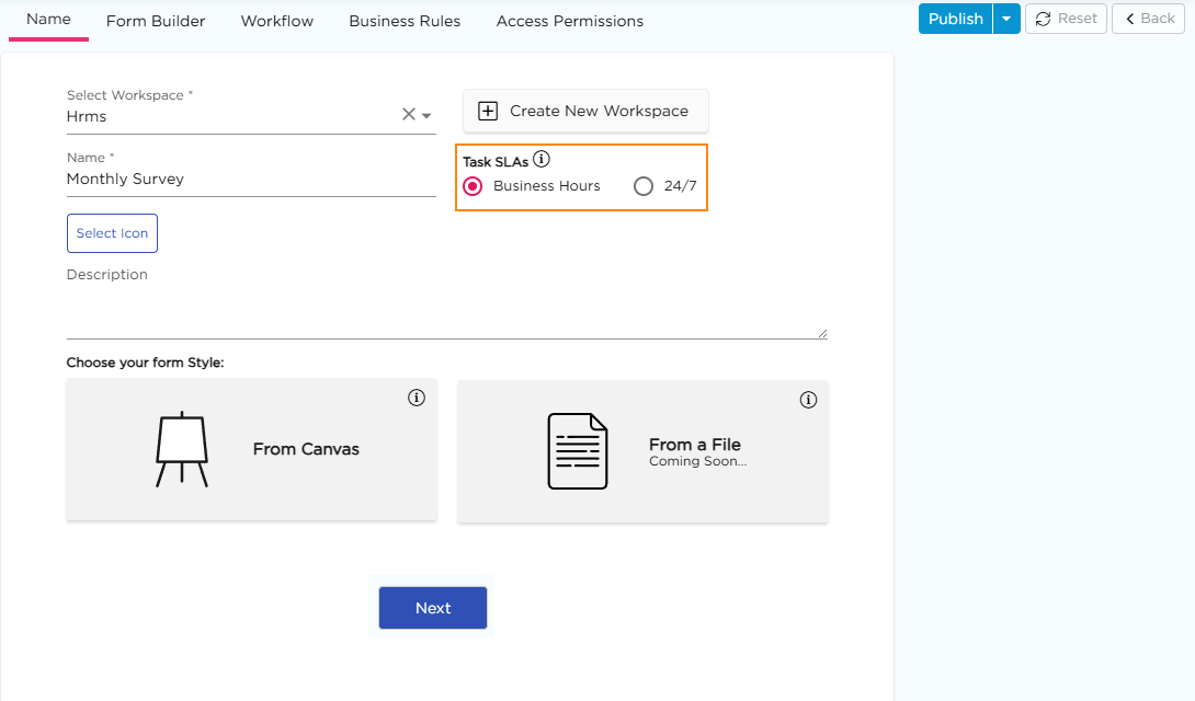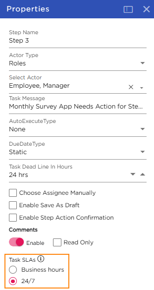 You can choose to generate Task SLAs only during the business hours defined in calendars (employee working hours) or 24/7 (any time of day and any day of the week).