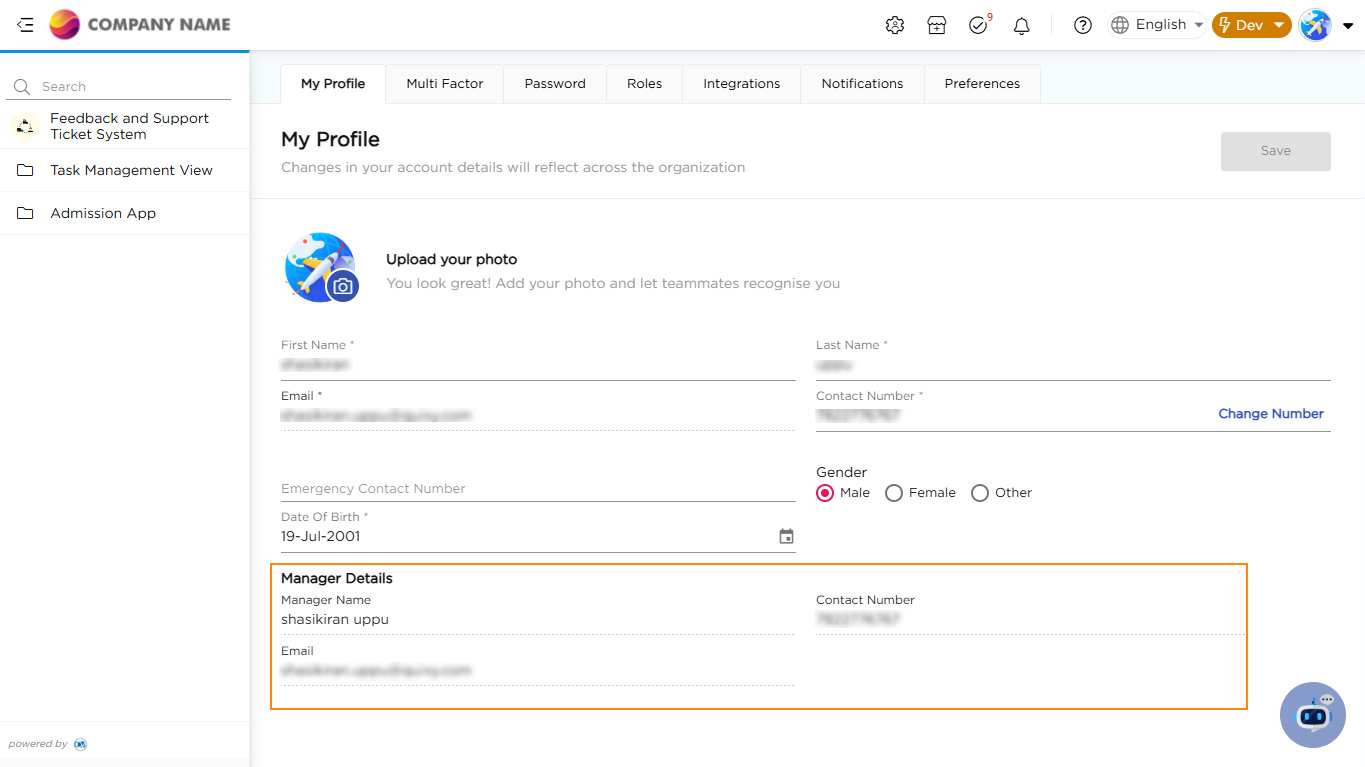 This area contains your personal details, such as your First Name, Last Name, Phone Number, Email Address, Gender, and Date of Birth along with the access to your manager's contact information.
