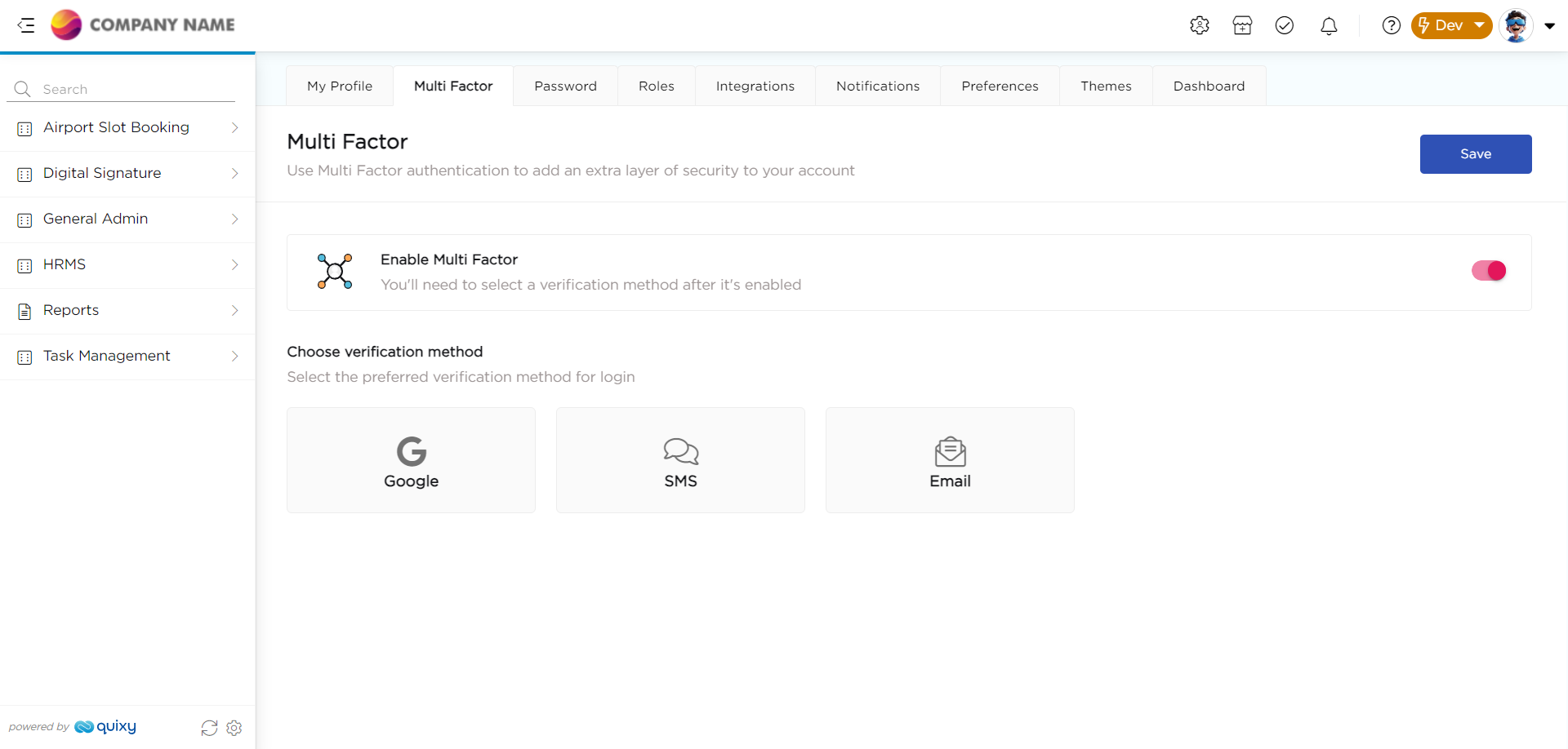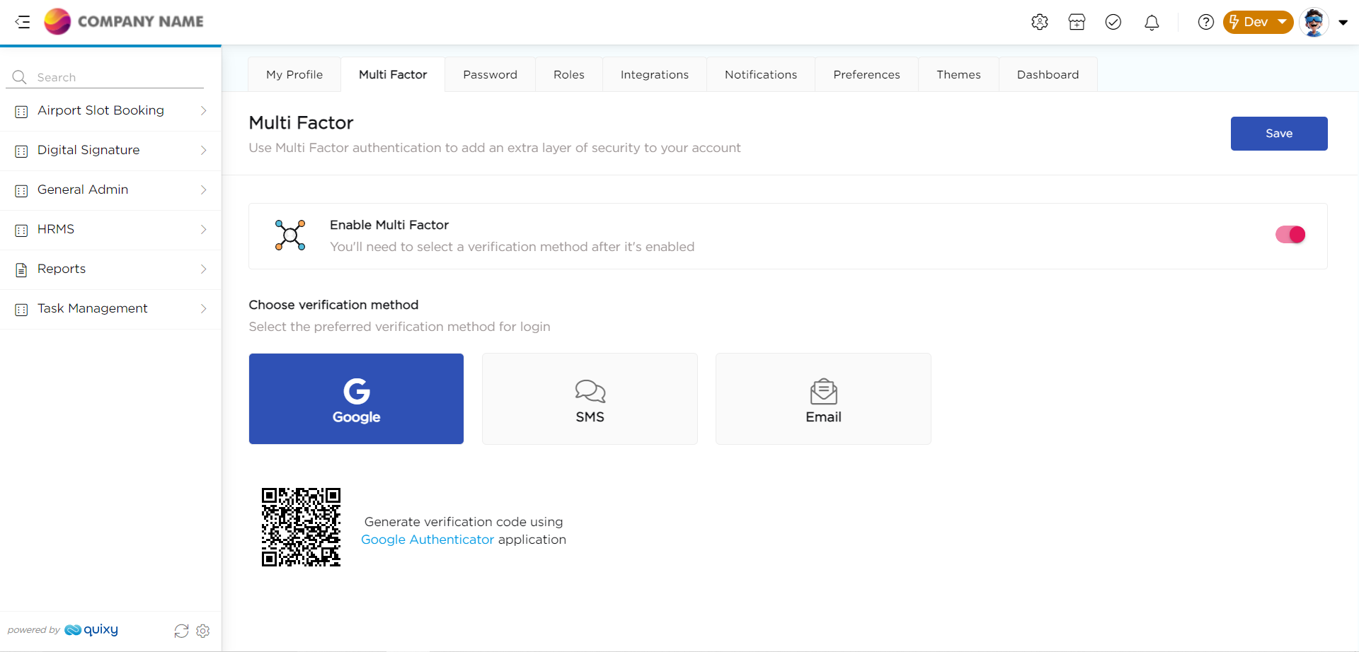 The verification code can then be used when logging in to the Quixy platform.