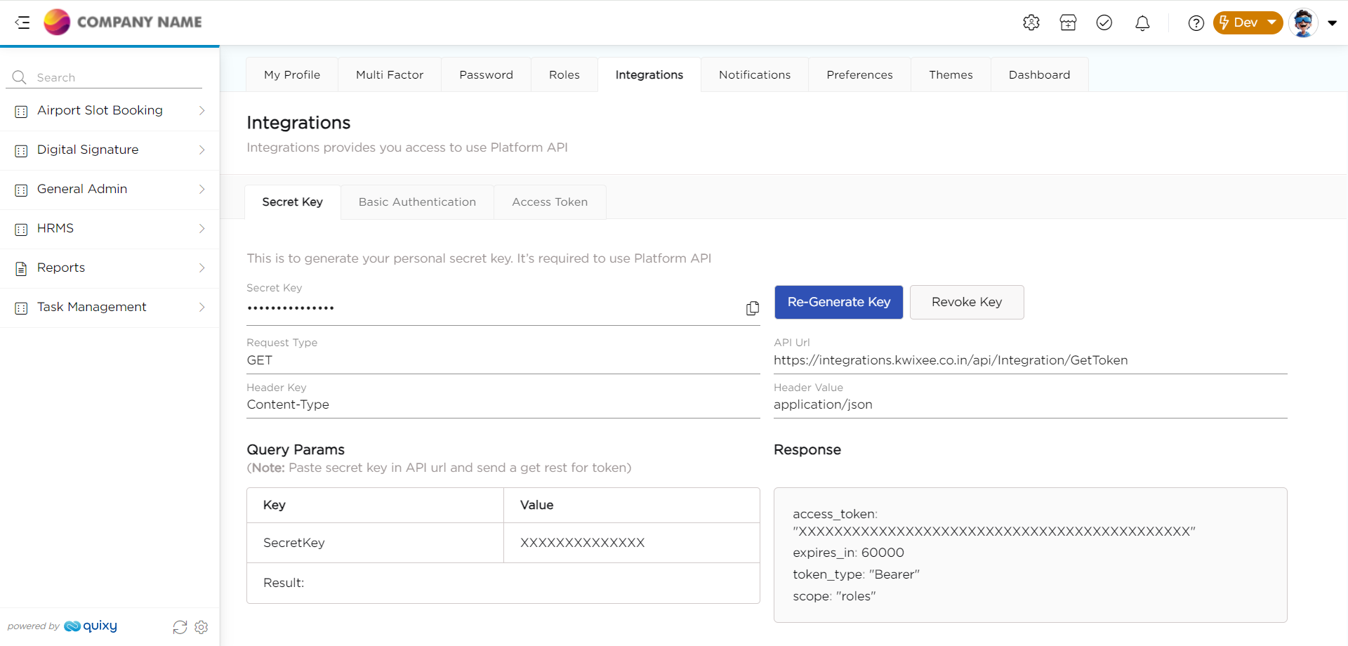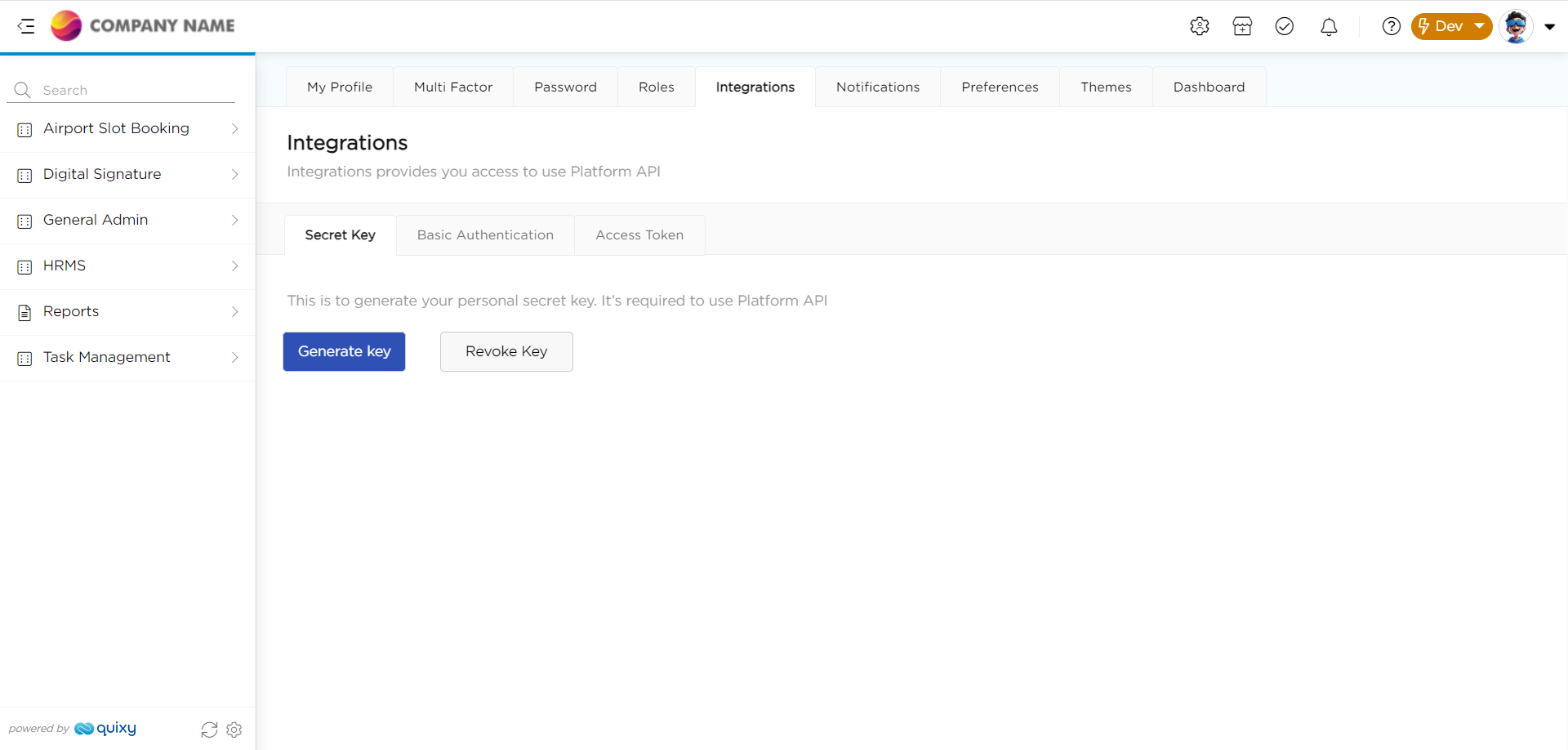 Generate Key: This feature helps you generate a key that you can use to connect external applications or programs. By generating this key and the API URL, passing it to the third party, you can establish a connection between the third party and Quixy.