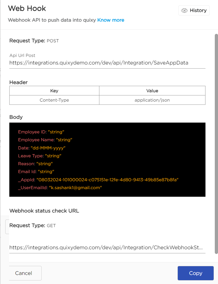 Webhook APIs allow third-party platforms to automatically push data into Quixy applications—without any manual intervention from end users. Once the Webhook API is configured, any event or data capture in an external system can instantly trigger data transmission into a designated Quixy app, streamlining data flow and eliminating redundancy.