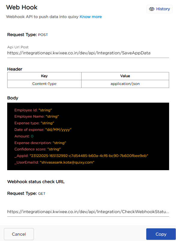 | 5 | History | Click History to view request status, execution time, user email, and remarks for each webhook call. Use this to monitor successful deliveries and troubleshoot failures. |