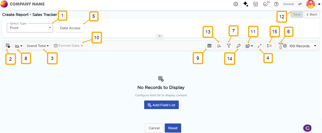 | 1 | Report Type drop-down | Displays the list of report types available in Quixy. |