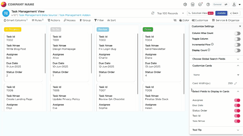 Select Fields to Display in Cards : Choose specific fields to show on each card for quick reference.