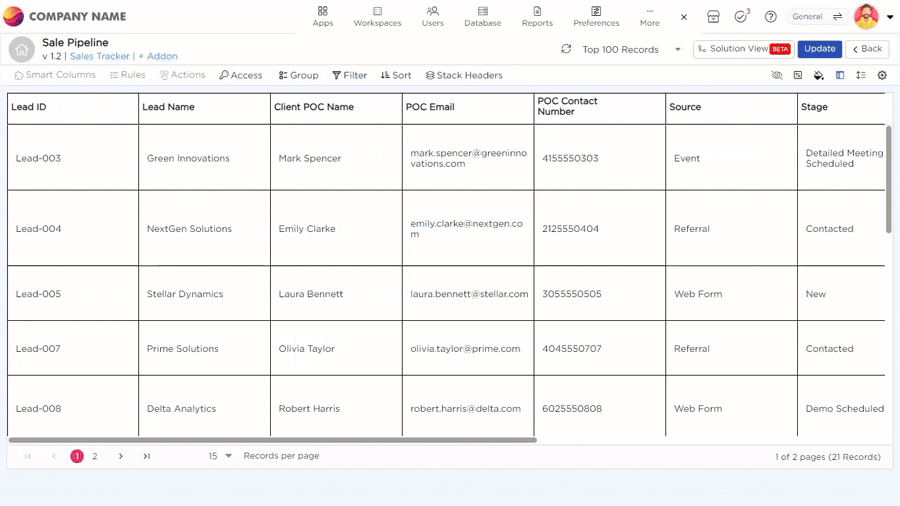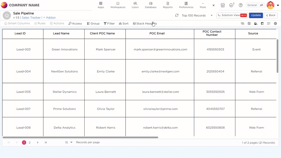 When you need to organize your data, the Stack Headers option helps group related fields together. For example, you can combine fields like POC Name and POC Email under a 'Point of Contact' section, or group Stage and Revenue Potential under 'Lead Details.' This makes your data easier to analyze and navigate, giving you a clearer view of important information.