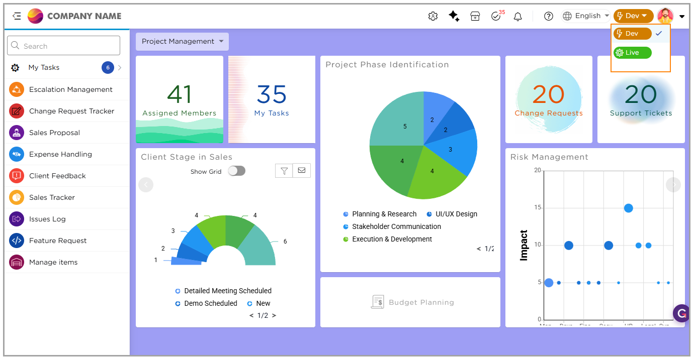 Authorized users such as Organization Admins and Workspace Admins can switch from the Live stage to the Dev stage using the stage selector available on the top bar. This allows them to move into development mode whenever they need to build or test solutions.