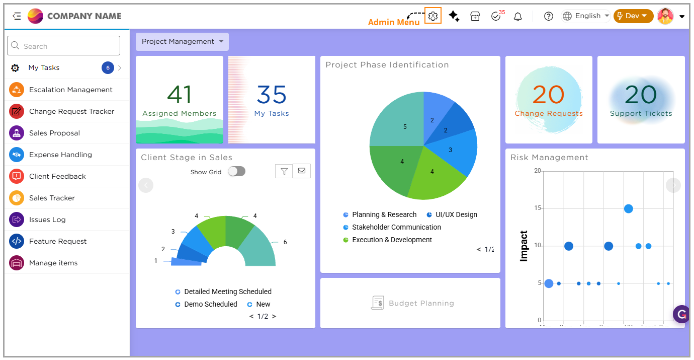 When a user switches to the Dev stage, the platform enters developer mode. In this mode, the Admin Menu becomes available.